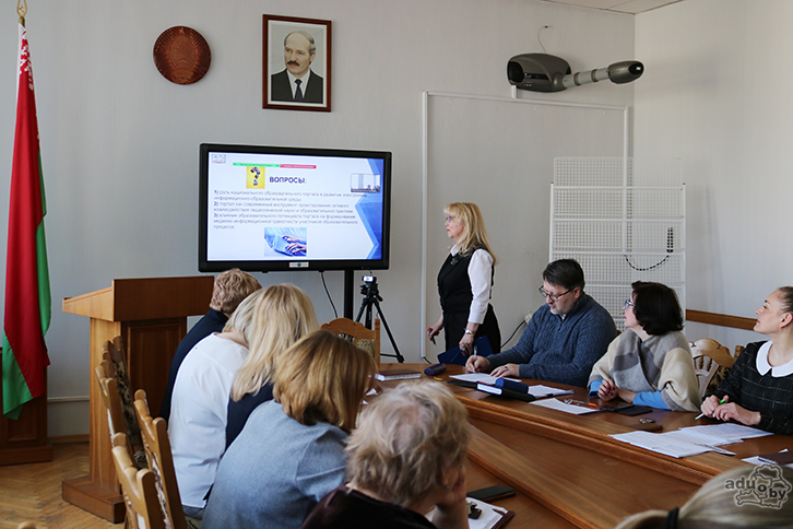 Юстинская Гюльнара Мансуровна, начальник управления дистанционных образовательных услуг, кандидат педагогических наук, выступила с докладом «О состоянии и развитии образовательного контента национального образовательного портала». В продолжение темы выступила Харевич Ирина Людвиковна, которая обратила внимание на состояние и развитие единого информационно-образовательного ресурса, разделов национального образовательного портала.