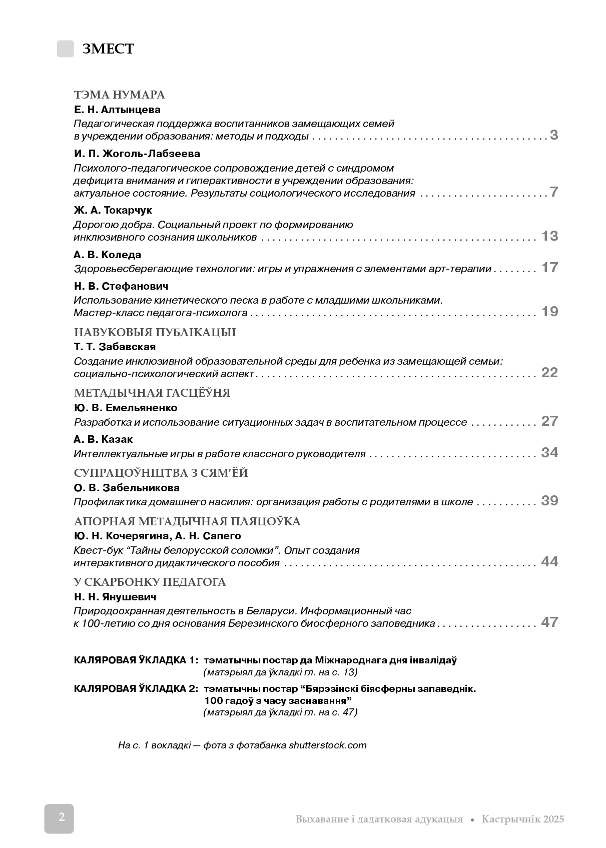 Педагогам-практикам адресуются интересные авторские разработки «Интеллектуальные игры в работе классного руководителя» и «Профилактика домашнего насилия: организация работы с родителями в школе». Заинтересует читателей и сценарная разработка информационного часа к 100-летию Березинского биосферного заповедника (тема отражена также на цветной вкладке журнала).