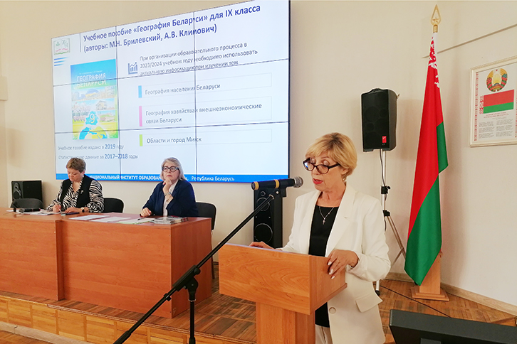 Директор института Валентина Васильевна Гинчук рассказала об исторической политике Республики Беларусь, современных подходах к оценке исторических событий и исторических личностей. Начальник методического центра Ольга Владимировна Сарычева обратила внимание на необходимость использования актуальных источников информации при изучении географии Беларуси. Старший научный сотрудник лаборатории гуманитарного образования Е.А. Темушева выступила с докладом «Раскрытие воспитательного потенциала литературных произведений. Расширение круга чтения учащихся».