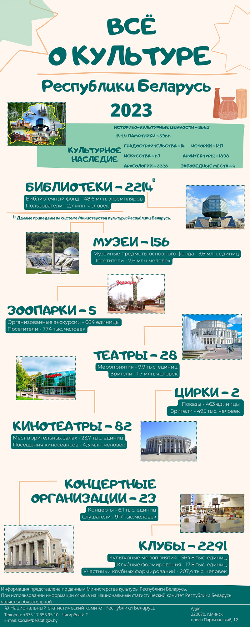 Наглядно о культуре нашей страны рассказывает инфографика, подготовленная Национальным статистическим комитетом Республики Беларусь.