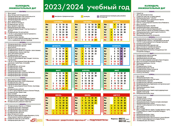 Цветные вкладки журнала содержат плакат по теме первого урока в новом учебном году («Беларусь и Я – диалог мира и созидания») и календарь на 2023/2024 учебный год с памятными датами, важными для организации воспитательной работы с учащимися.