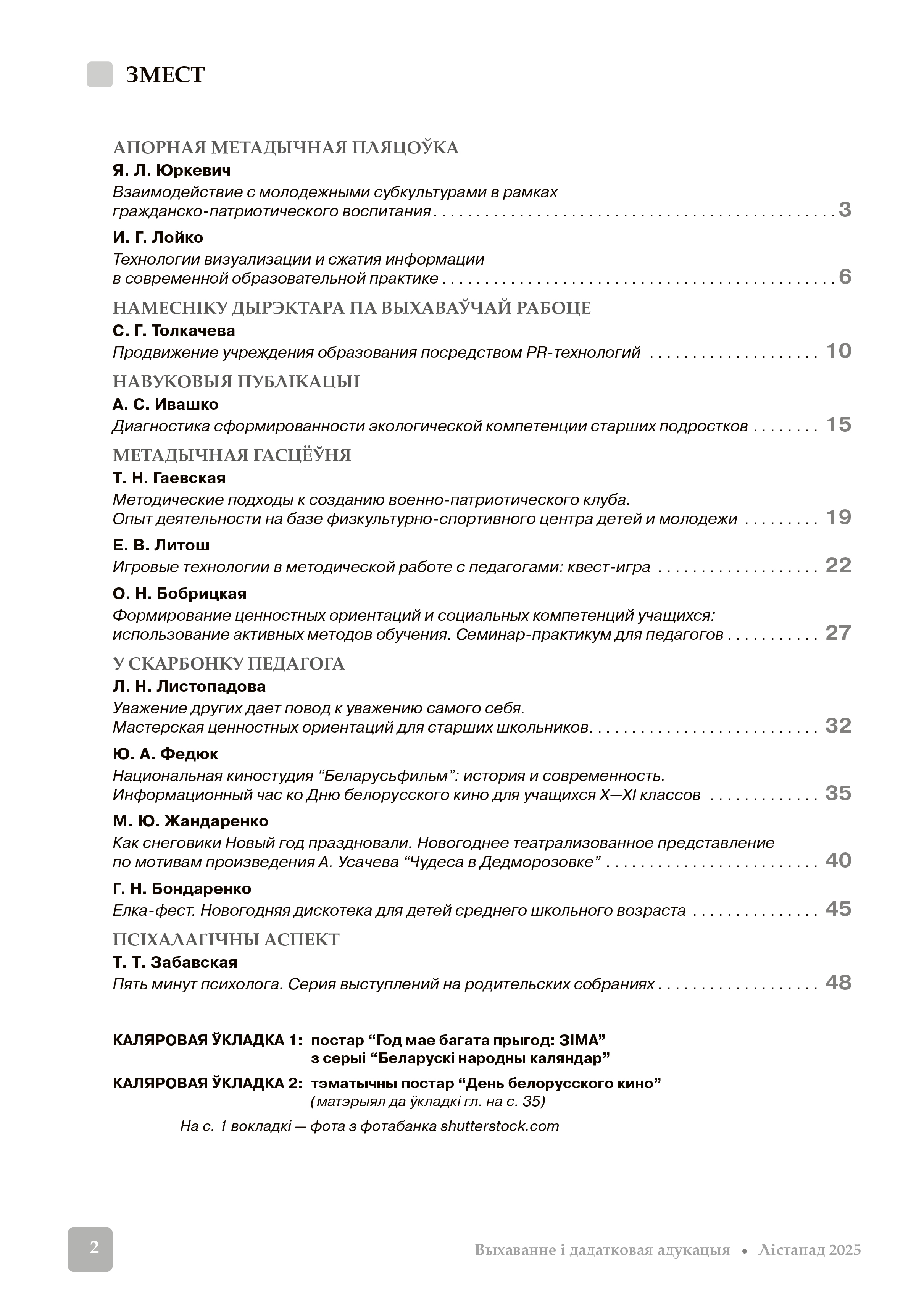 Педагогам-практикам адресованы сценарные разработки информационного часа для старшеклассников ко Дню белорусского кино (с цветным тематически постером), а также оригинальных театрализованных новогодних программ.