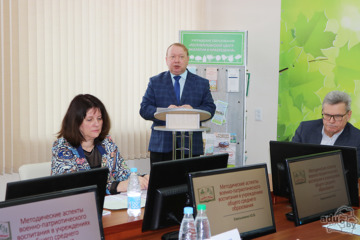 Емельяненко Ю. В., заместитель начальника управления воспитательной и идеологической работы методического центра Национального института образования, осветил методические аспекты военно-патриотического воспитания в учреждениях общего среднего образования.